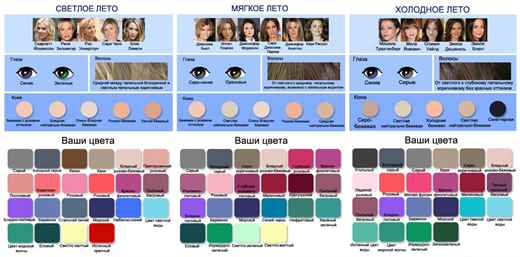 — светлое лето: соответствует природным краскам, характерным для первого месяца лета. Все тона во внешности мягкие и светлые. Больше преобладают холодные цвета. Цвет волос может быть как блонд, так и светло-русый. Глаза бывают голубоватого или зеленого оттенков. Кожа плохо подвержена загару и имеет светлый, даже немного бледный тон. Глаза имеют светлые тона серого, зеленого и голубого цветов. Волосы от светлого цвета до коричневого. Кожа практически не поддается загару и может иметь розоватый оттенок.