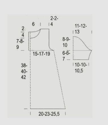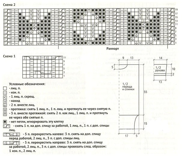 Начинаем вязку с набора спицами 143п. Вывязываем резиночку, потом переходим на узор по сх.1: сначала нужно связать с 7-ой по 21-ую п., потом 6 раз с 1-ой по 21-ую п., заканчиваем 2и. Делаем 36 рядков, потом трижды повторяем 35-56р. от * и до *. Свяжем еще 8р. Оставшиеся 68п. выполняем лиц. гл. На 35см от резиночки под проймы закр. с двух сторон в четных р. 1р. по 3п., 1р. по 2п., 2р. по 1п. Дальше – прямым полотном. На 50см для выката закр. центр. 18п. и каждую часть довязываем отдельно. Для плавного перехода по внутр. стороне закр. в четных р. 1р. по 5п., 1р. по 4п. На 51см для плеча по боковой стороне закрыв. в четных р. 1р. по 4п., 1р. по 5п. Вторую половинку довязываем аналогично.
