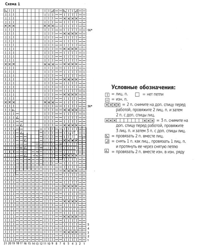 1р.: 1кр., 3и., 11л., 5и., 11л., 5и., 11л., 5и., 11л., 5и., 47л., 5и., 11л., 5и., 11л., 5и., 11л., 5и., 11л., 2и., 1кр. На 11л. мы будем реализовывать сх.1, а на 47л. – сх.2. Продолжаем вязание ровным полотном до 55см. На 85см закрыв. п.
