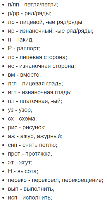 Сокращения, а также усл/обозначения для работы (спицы)