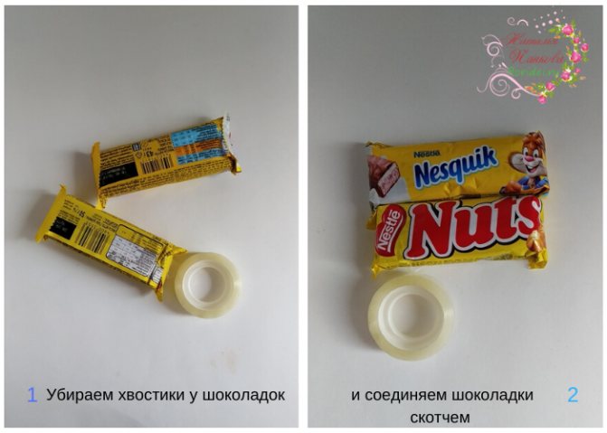 Хвостики следует у шоколадок предварительно подогнуть с помощью узкого скотча.