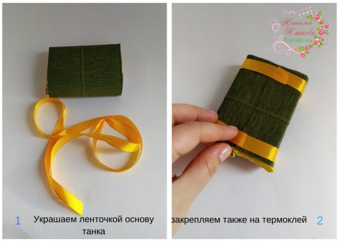 Чтобы украсить наш танчик, возьмите желтую узкую атласную ленточку и закрепите ее с двух сторон.