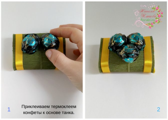 Далее соберем шоколадную броню. Берем небольшие шоколадки «Сникерс» (можно и другие, какие любит ваш мужчина) и приклеиваем их на заготовку. Гусеницы тоже можно выложить из конфет в форме узких палочек. Приклеим колеса (медальки) — и все, танк из конфет своими руками для любимого защитника мы приготовили!