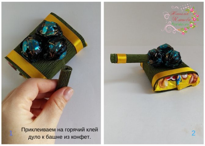 Она послужит в качестве дула у танка. Все конфеты и шоколад крепятся двусторонним скотчем. Подставку для такого серьезного танка также надо делать серьезной, так как вес его довольно внушительный, и обычный картон его не выдержит.