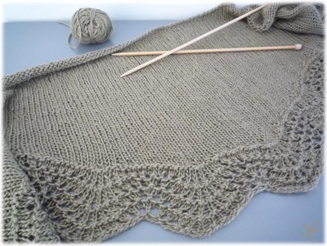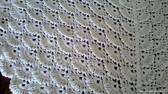 Изделие будет готово на высоте 90 см (или по достижению 72-го ряда). Верхних край шали чешуйки должна украсить обвязка из СБН.