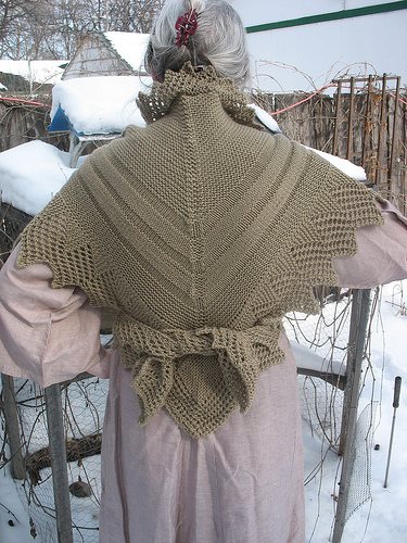 Вязание спицами старинной шали по описанию реставратора датского музея. Эта шаль имеет элегантную кайму и полосы структурной глади. Перекрестив концы шали по груди и завязав их вокруг талии, этой шалью женщины, работая, могли пользоваться каждый день.