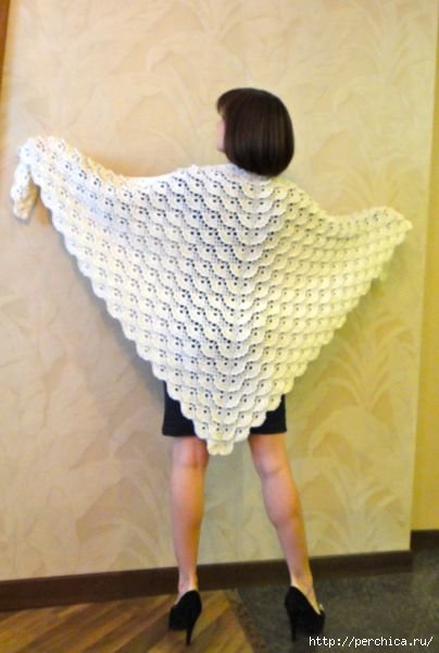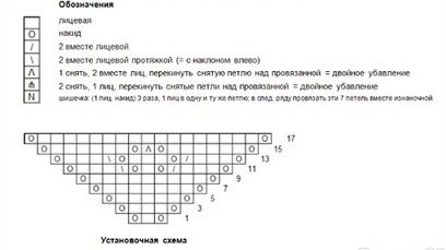 Начинают вязать из центра верхнего края изделия. Продолжается работа по направлению сверху вниз, к нижней части спины, где будет угол треугольника. Сначала применяется простая чулочная вязка, а затем на определённом этапе следует переход к схеме ажурного узора, который украшает края шали. Для того чтобы разобраться в описании работы поможет мастер-класс: