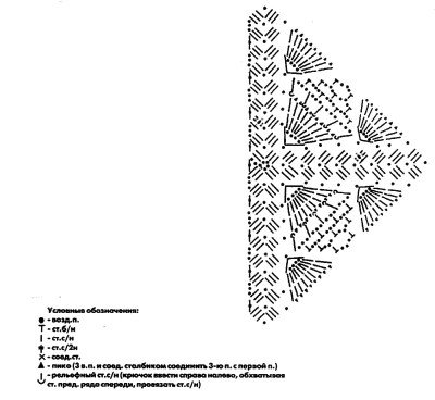 Необходимо помнить, что эта схема демонстрирует только половину треугольника. Она не показывает первые 3П, последние 3 П ряда, а также ту П, которая находится по центру. По этой причине нужно соблюдать такую последовательность работы. Сначала вяжите первые 3 П каждого отдельного Р, потом ряд по схеме и отмеченную маркером среднюю П. Далее надо продолжить создание Р по схеме, и закончить последними тремя петлями.