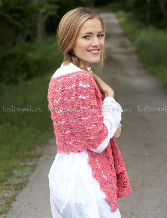 Эффектная шаль с красивейшим узором. Если использовать тонкую пряжу, можно носить в прохладные летние вечера. Процесс выполнения долгий, но не сложный. Поэтому данная модель подойдёт для начинающих мастериц, которые обладают большим количеством времени и терпения. Быстро завершить работу не удастся.