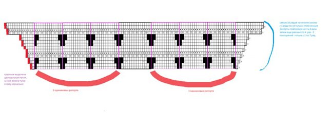 - При переходе к вязке по ажурной схеме раппорт повторится 3 раза, далее прибавляются петли, полотно расширяется на один раппорт при каждом полном провязывании схемы.