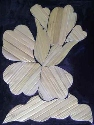 Есть еще такая техника среди аппликаций, как выкладывание соломкой. Правда, сам процесс изготовления вручную такой соломки очень трудоемкий и длительный, но и купить ее тоже можно. Например, вот такие работы бывают: