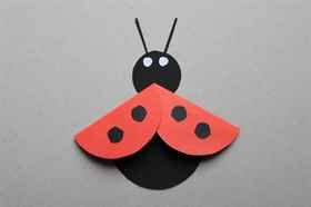 Большинству детишкам этого возраста очень нравится вырезать различные фигурки и наклеивать их на бумагу. Особенно интересно изготавливать объемные аппликации. Например, для создания божьей коровки необходимо вырезать из красной бумаги два кружка, а из черной — полуовал, далее вырезаем черные круги или рисуем черные точки и затем один кружок приклеиваем над черным полуовалом, а второй загибаем пополам и клеим к первому кружку. На последнем этапе приклеиваем глазки и усики.