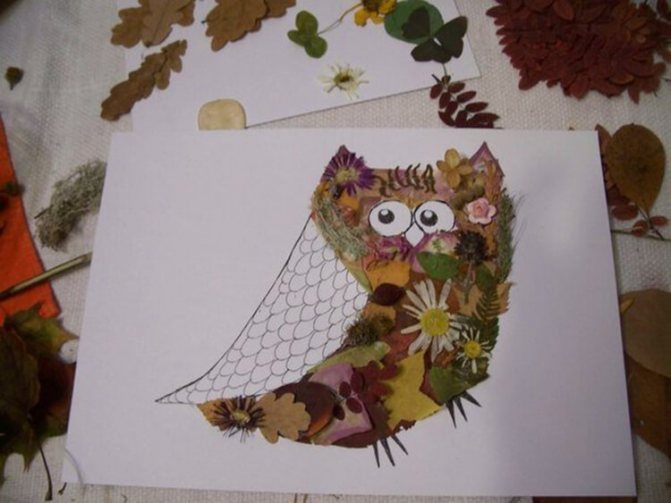 - Накладная аппликация. Простой вид, который не требует дополнительной работы с листьями – они наклеиваться на лист бумаги или картона, создавай задуманный сюжет. Это могут быть животные, деревья, грибы. Можно дорисовать какие-то детали.