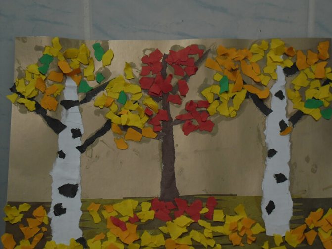 Аппликация на эту тему раскроет ребенку понятие, как лето меняется на осень, что происходит в этот период в природе. Ведь на деревьях еще много листьев, есть зеленые, но также появляются красные, оранжевые и бордовые.