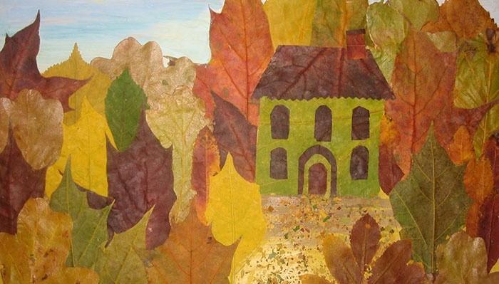 - Для дорожки, ведущей от домика к лесу, мелко нарежьте разноцветную листву.