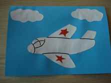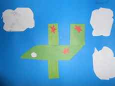 Теперь приклеиваем самолетик на голубую основу, затем вырезаем из белой бумаги облака и тоже приклеиваем на свободное пространство вокруг самолетика. Если не найдется голубого картона, можно приклеить на белый, облака сделать светло-голубыми или нарисовать их.