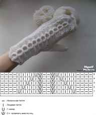 Закономерность здесь следующая: делаем прибавку каждые два ряда, увеличивая на 2 петли. Достигнув основания большого пальца, снимаем необходимое количество петель на булавку, измерив заранее окружность пальца. На спицу, которая окажется перед клином, добавляем семь петель и вяжем основу нашей варежки вплоть до самого конца мизинца, используя рисунки со схемами ажурных узоров.