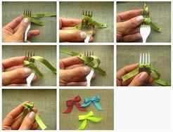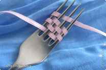 На вилке также можно завязать более нарядный двойной бантик. Для этого вилку снова берут в левую руку, а правой просовывают ленту между зубчиками, чередуя их. Справа оставляют небольшой кончик. Дойдя до края вилки, ленту разворачивают и делают еще один такой же ряд немного выше. Так должно получиться четыре или пять рядов.