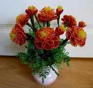 Итак, если рукодельница решила проявить себя в бисероплетении и сделать букет бархатцев, следует выполнять следующие указания, чтобы создать красивую поделку из бисера. Один цветок будет состоять из четырех рядов бисера. Эффективно будут смотреться желтые и оранжевые или красные бисерины. Каждый ряд отличается размером от предыдущего. Верхний слой цветка состоит из маленьких лепестков из пяти желтых бисерин, согнутых в соответствующую форму.