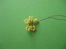 Все ряды скрепляются в один цветок, а под ним на каждую из проволок нанизывается по восемь зеленых бисерин. Это будет основанием цветочного бутона. Подробная схема плетения бархатцев и листьев из бисера предоставлена в видео ниже.