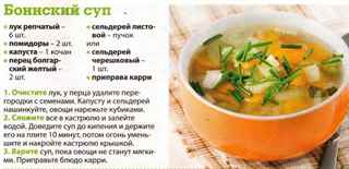 | Вторник | Завтрак: Яйцо всмятку. Обед: Боннский суп (рецепт 2). Ужин: Тушеные овощи (кабачки, баклажаны). | Избегать сладких напитков и фастфуда. |