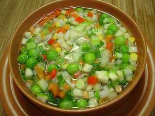 Потребуются шесть головок репчатого лука, столько же помидоров, зелень любая, два перца болгарских, небольшой вилок капусты, корнеплод сельдерея и специи. Все овощи следует помыть и мелко нарезать. Взять подходящую по объему кастрюлю и залить их водой. Варить до готовности, в конце добавить специи. Для придания вкуса можно добавить чеснок и травы. Если суп кажется слишком пустым, то можно добавить немного растительного масла. Данное блюдо хорошо влияет на работу желудка и помогает очищению организма.