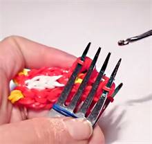 Шея совы. С одного центрального зубца вилки снимаем розовые резинки и надеваем на другой. На каждой вилке должен остаться один свободный центральный зубец.
