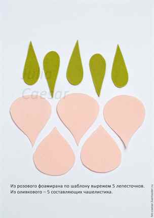 - По шаблону вырезаем по 5 одинаковых деталей для бутона и чашелистика: