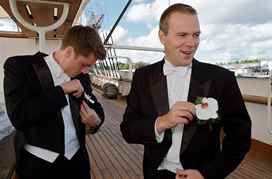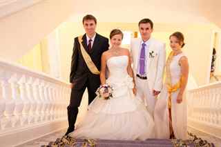 Обычно на свидетелей надевают яркие ленты или вдевают в кармашки бутоньерки. Костюм друга жениха должен гармонировать с платьем подружки, но их одежда не должна быть ярче молодых. Ведь свидетель и свидетельница служат фоном молодых на свадебном торжестве.