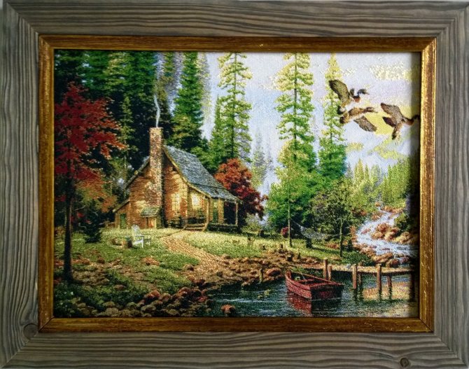 Пейзаж, вышитый с помощью гобеленового шва, способен существенно улучшить эстетические качества комнаты