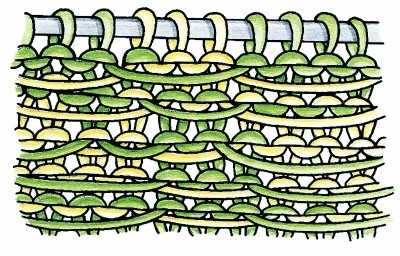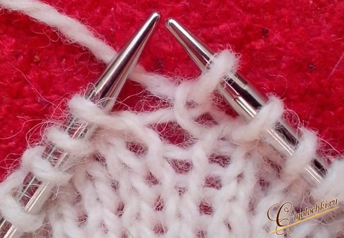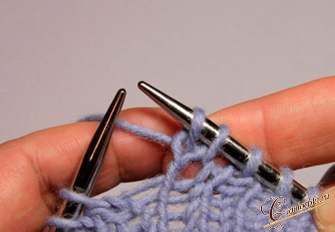 При вязке изнаночного ряда нити переплетаются перед полотном.