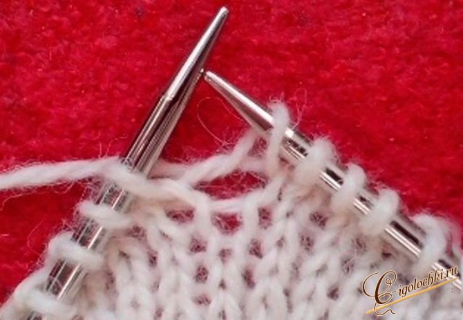 - На правую спицу снимите петлю таким образом, как будто хотите вязать ее изнаночной.