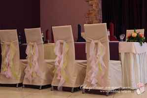 - Прикрепив к верхней части спинки. Если у стульев не цельный задник, а состоит из отдельных элементов, то верхняя часть будет доступна для «ленточного волшебства». Возьмите ленты в тон вашей стилистике. Если нет выбранных преобладающих цветов, то подберите ленты пастельных тонов: (белые, розовые, бежевые, лиловые, персиковые).
