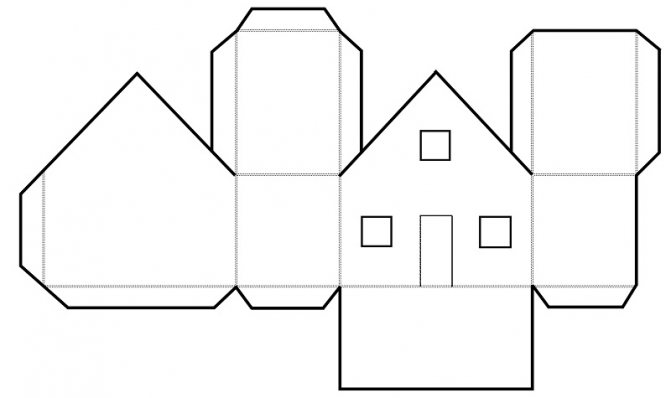 Технология работы будет следующей. Вырезав обозначенную здесь фигуру, ее складывают и подклеивают. Затем используют в качестве основы для домика из трубочек.