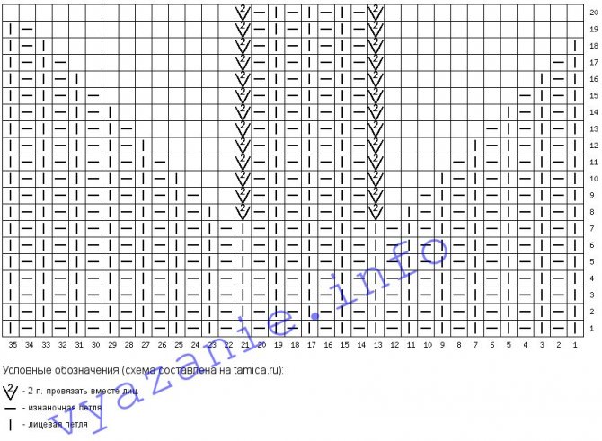 - В начале ряда выполняют УБ, провязывая 2 П вместе изнаночной петлей. Далее вяжут 25 ИП и снова УБ, так до конца ряда.
