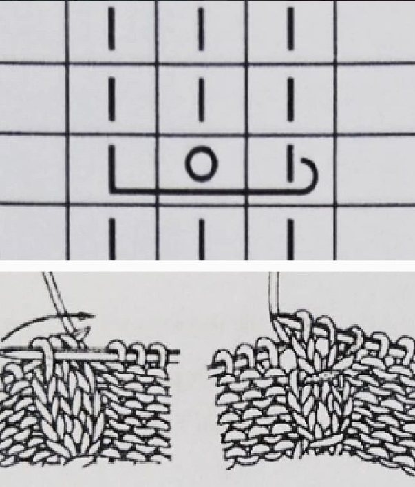 Вставьте правую иглу справа налево во вторую петлю снизу рабочей нитки и, зацепив концом спицы нитку, втяните ее в извилину. Оставьте на правой справа.