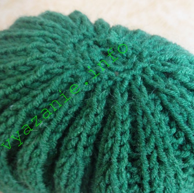 Шапка на этом фото вяжется снизу вверх. Ряды обыкновенные, не укороченные. Будем вязать без шва.