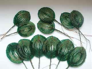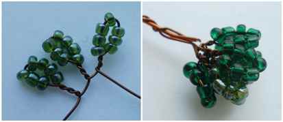 Каждый бутон состоит из 7 петелек, каждая петелька – 7 бисерин, которые набираются 2-мя оттенками зеленого. Нужно набрать 7 бисерин на тонкую проволоку, затем скрутить кончики, и через небольшое расстояние (около 0,5-1см) делать следующую петельку. И так 7 раз. Далее они скручиваются вместе, лишняя проволока обрезается, и в оставшийся кончик вплетается более толстая проволока (длина около 15см). Всего таких бутов должно быть три.