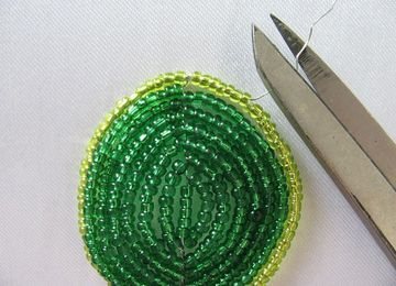 - Всего в листочке должно быть 13 рядов зеленого цвета и 2 ряда светло-зеленого цвета. Остаток проволоки закручиваем, а с другой стороны аккуратно заправляем в отверстие бисера и обрезаем лишние.