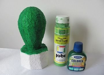 В магазинах для творчества и рукоделия продаются готовые формы — основы. Если подходящей нет, можно изготовить её своими руками из пенопласта, придав нужную форму с помощью ножа. Основу следует раскрасить в зелёный цвет или плотно обернуть зелёной изолентой. В цветочный горшок залить гипс и разметить будущий кактус в центре. Края замаскировать камешками или разноцветными крупными бусинами.