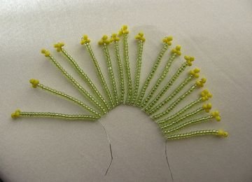 - Теперь необходимо сделать из бисера цветок для нашего кактуса. Для создания тычинок набираем на проволоку 17 бисеринок светло-зеленого цвета и 3 желтого. Делая петлю из желтых бисера, длинный конец проволоки просовываем в отверстие зеленых бисеринок в обратном направлении. Таким способом необходимо сделать веер из 18 тычинок разной длины.