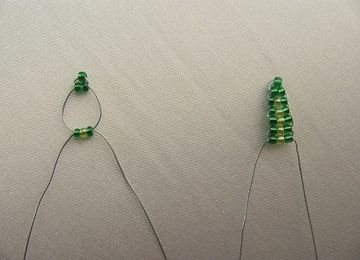 - На проволоку нанизываем 5 бисеринок зеленого цвета и полностью закручиваем один конец проволоки. Второй конец мы также закручиваем, но оставляем свободным.