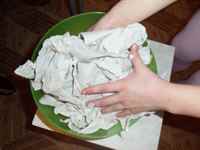 Сложить кусочки бумаги в миску, залить водой. Все фрагменты сухой массы должны быть в воде. Оставить массу разбухать на 24 часа. Отжать получившуюся бумажную массу.