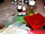 Далее растапливаем остальную мыльную массу, придем ей яркость и насыщенность цвета, добавив туда пищевую краску. Потом добавляем ароматизатор и, по желанию, косметическое масло.