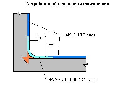 Структура обмазочной гидроизоляции с армированием и галтелями.