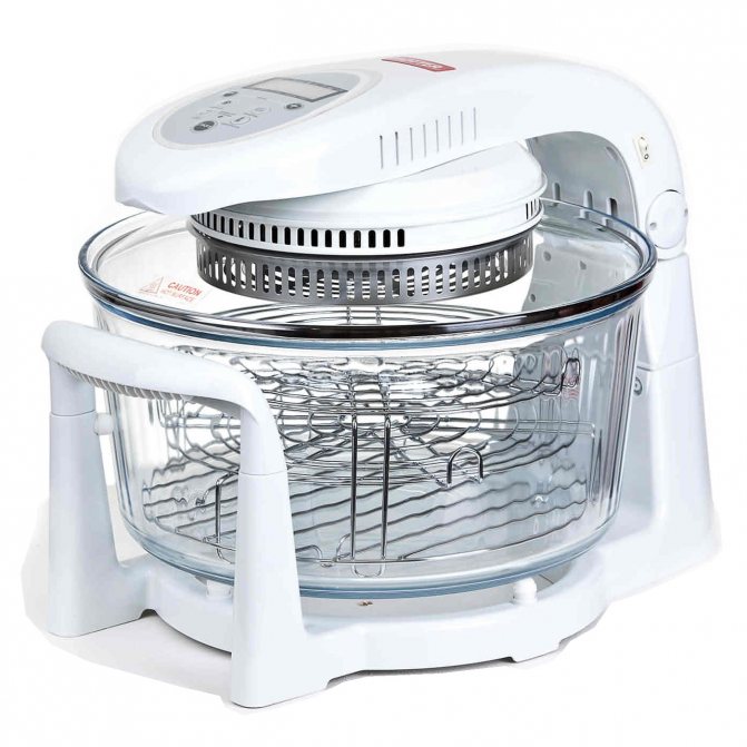 В основе аэрогриля – электрическая печь, которая подогревает продукты не снизу, а сверху. Прибор представляет собой круглую стеклянную емкость объемом 6-17 л на пластиковой подставке. В комплект входит крышка диаметром 300-450 мм. Внутрь прибора помещают решетку или противень для продуктов, которые выкладывают сверху в натуральном виде или предварительно заворачивают в фольгу.