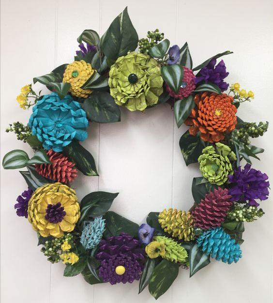 Вариаций венка из шишек огромное множество. К примеру, можно создать совершенно летний венок: