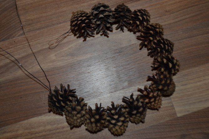 Чтобы сделать дно вставляем внутрь 4 шишки. Они плотно держатся, поэтому проволокой их не соединяем.