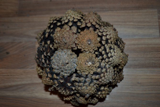 Более крупные конструкции выполняются почти из двух сотен шишек, для прочности скрепляемых друг с другом при помощи проволоки. Здесь все элементы укладывают дном наружу – так конструкция выглядит эстетичнее, аккуратнее, а по причине того, что клей здесь отсутствует, выходит полностью экологичным. Чтобы прикрепить одну шишечку к другой, ее огибают проволочной петлей, а «цепочка» из нескольких предметов замыкается в кольцо.