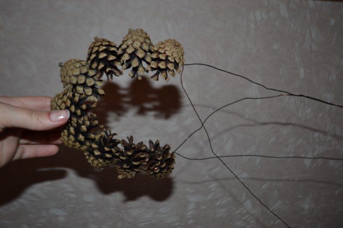 - дно составляется из 7-11 шишечек, прикручивается проволокой к остальной части. Иногда его выполняют из картона, но это не так красиво;